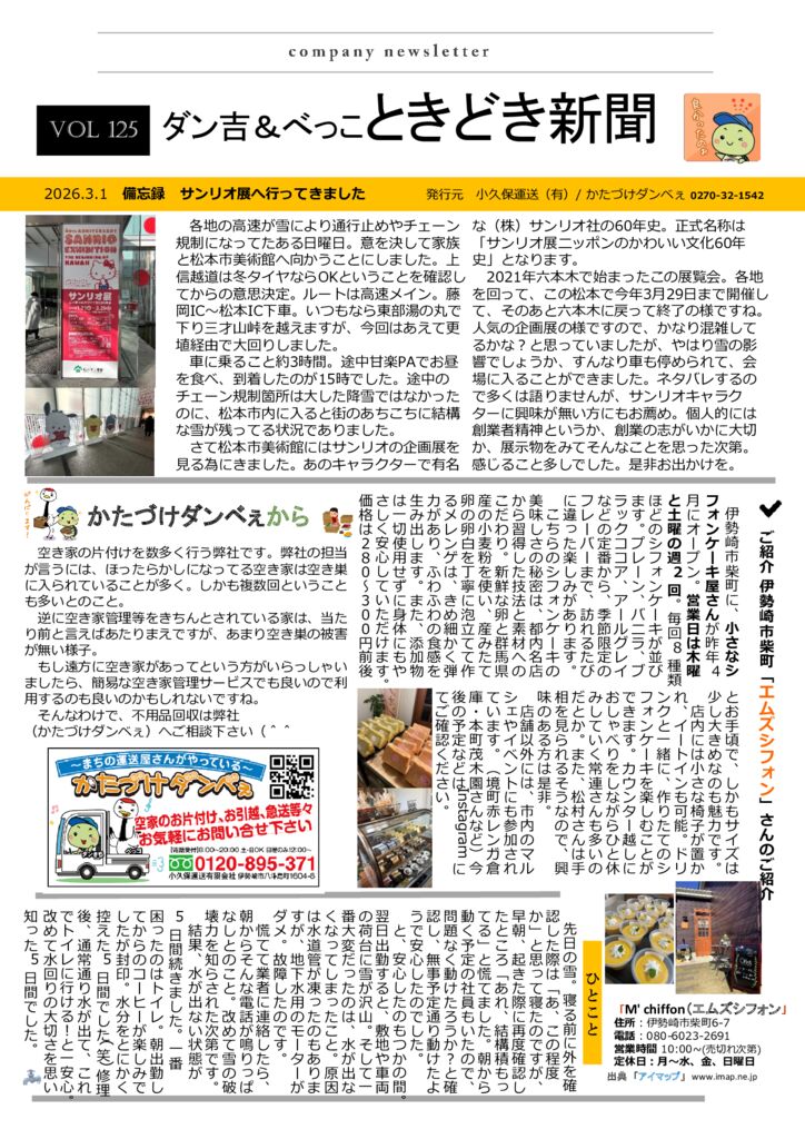 さて2026年1月発行のvol123号ニュースレターですが、蛇年が終わって午年が、どうなるの?2026と称し冒頭にミニコラムを。ネタも無いので(笑)、私のどうでもいいワンパターンな三が日の過ごし方をご紹介。年齢も重ねてきましたので、そろそろこのパターンどうなんだろう?って、ホント思っています。グルメのご紹介は、伊勢崎市小泉町まつや食堂さんのご紹介。実際私もときどき行ってる、お薦めなお店。親しみやすくてお値段も味もボリュームも◎。地元で愛されてるだろうなぁって、そんな雰囲気のお店です。取材もとっても協力的だったと、記者の話し。かたづけダンベぇからは、最近とても多くなってきた、空き家になってた、あるいは廃墟化してる、そんな実家や身内にまつわるお家のお片付けについて。色々なモノが値上がりしている昨今。見積だけでもとっておくことをお薦めいたします。そして一言には、私(社長)が25年務めさせて頂いた、非営利団体NPOの責任者を辞するお話。ここでご紹介しているお店やグルメの情報は、そのNPO(伊勢崎市の情報をネットで発信することを活動としています。HPアイマップ)からの情報です。自身にとっての備忘録な、つぶやき的なコラムを掲載してみました。よろしければご笑読下さい。2026年も何卒宜しくお願い致します。