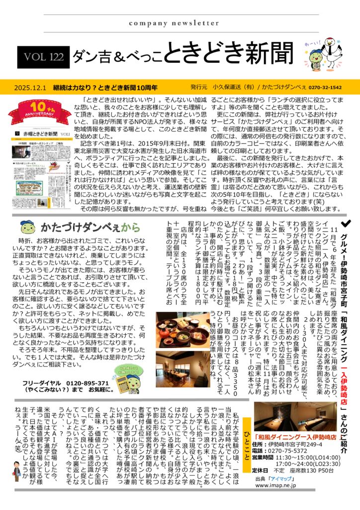 継続は力なり。ニュースレターを発行して10年が経ちました。毎月毎月、ネタを考えたりするのが大変なんですが、良く続けてきたなと思います。10年を振返ってみて、今の気持ちを述べさせて頂きました。グルメのコーナーは、伊勢崎市宮子町の人気店、和風ダイニング 一入(ひとしお)様のご紹介。知ってる人も多いと思いますが、プライベートでも利用させて頂いてるお薦めのお店です。かたづけダンベぇからは、片付けの現場から出てきたモノを、次の方にお渡しするのにネットを活用してる、そんなお話。ひとことから、AIが登場してこれから大学へ行く意味、もしかしたら変わってしまうのか??一浪人並みと言われた時代を過ごした私からの、未来予想(笑)